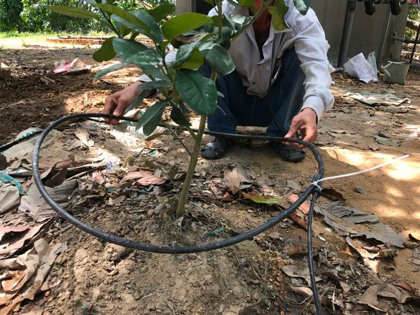 Hình : Tưới nhỏ giọt cuốn gốc cho cây Bưởi giai đoạn mới trồng...