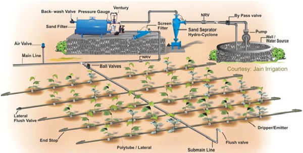 Tùy vào quy mô của khu vườn, điều kiện địa hình, loại cây trồng để có những thiết kế hệ thống tười nhỏ giọt phù hợp. Tuy nhiên hệ thống lắp đặt thường có: Bộ lọc, van nước, bơm, ống dẫn, đầu nhỏ và các phụ kiện khác (ống co, thiết bị cố định, vật liệu xây dựng…)