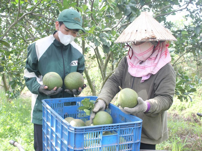 Người dân thu hoạch bưởi theo hướng GlobalGAP ở xã Thanh Hòa, huyện Bù Đốp. Ảnh: K GỬIH/TTXVN