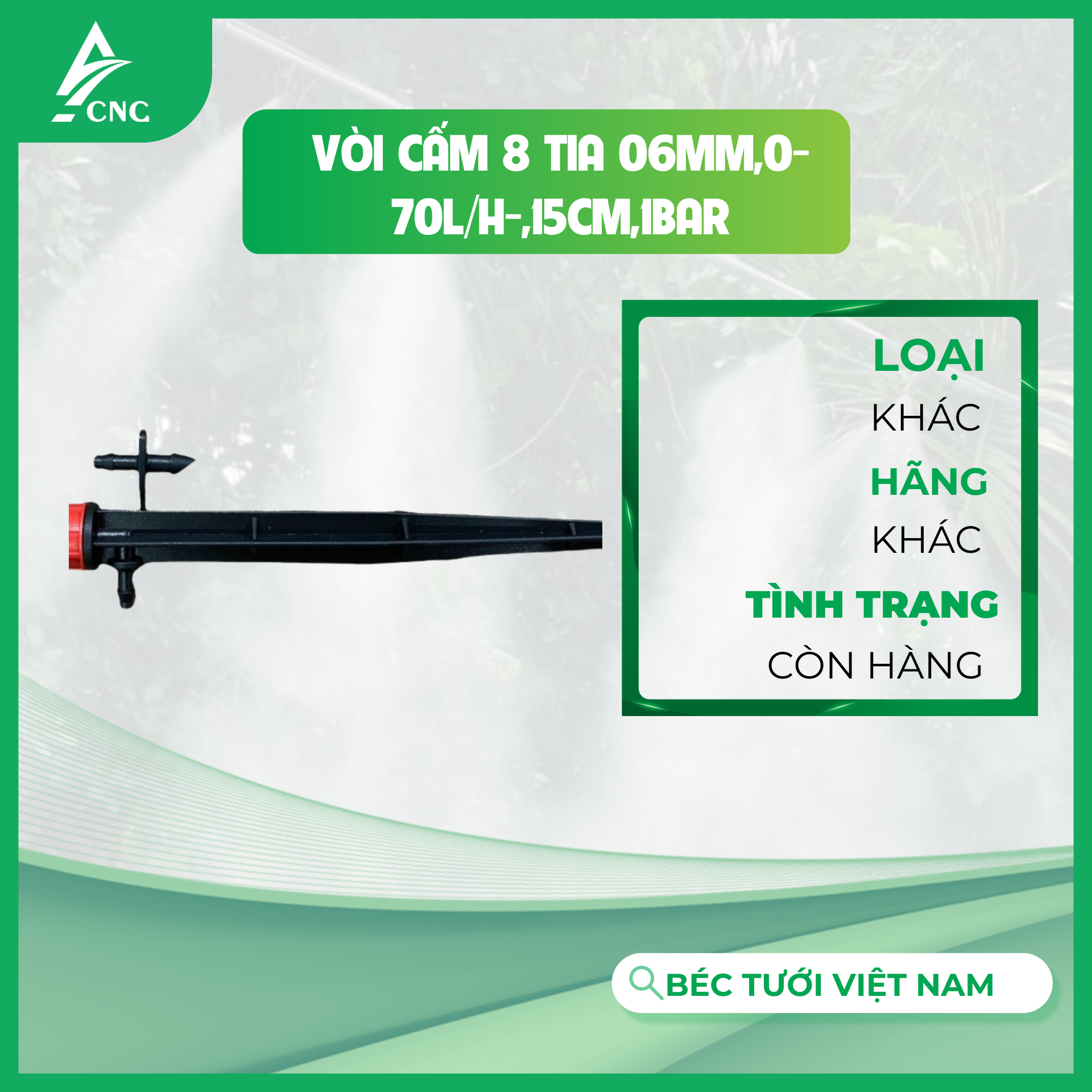 Vòi cắm 8 tia 06mm chuyên tưới cây ăn trái, cây công nghiệp, cây bụi, tưới cảnh quan. Có thể ứng dụng tưới chậu cây, gốc cây ,thích hợp với tưới cảnh quan sân vườn nhỏ.